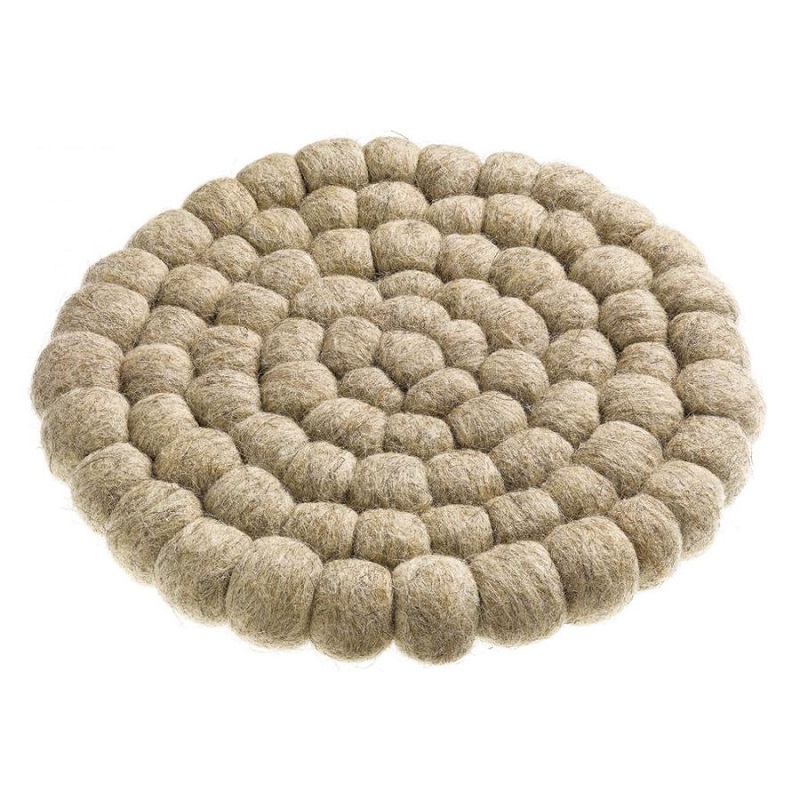 Confectionné en 100% laine recyclée, il séduit par son design artisanal, sa texture douce et sa robustesse naturelle. Chaque pièce est unique et raconte une histoire de savoir-faire durable. Le set de table Brian se distingue par ses boules de laine tressées, formant un motif circulaire à la fois graphique et chaleureux. Grâce à l'épaisseur de la laine compressée, il protège efficacement votre table de la chaleur des plats et est naturellement résistant.