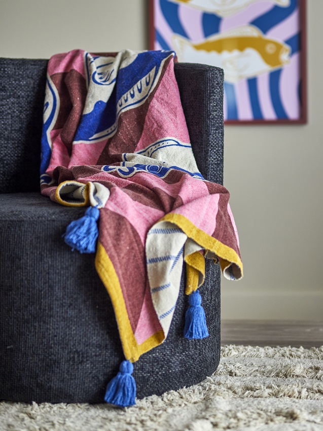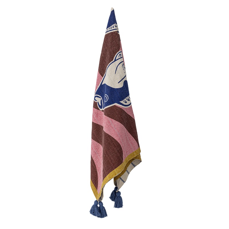 Le plaid Remy de Bloomingville est confectionné en coton tissé, avec un motif imprimé sur une face et des rayures tissées sur l’autre. Ses tons chauds, ses accents diagonaux, sa bordure contrastante et ses pompons aux coins lui confèrent un style harmonieux et soigné.